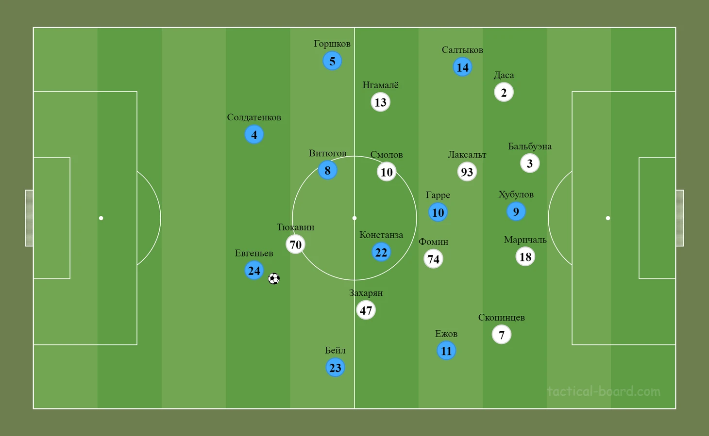 Игорь Осинькин выставил схему 4-2-3-1 с Витюговым и Костанза в опорной зоне. Без мяча Ежов и Гарре садились в одну линию с центральными полузащитниками, а Рахманович поднимался выше и оборонялись «Крылья» по 4-4-2.