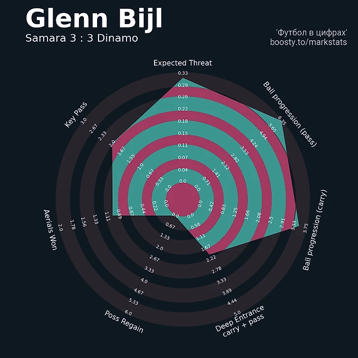 Динамовцы всё больше не добегали, а «Крылья» увеличивали давление. После перехода в центр Гарре был меньше привязан к позиции. Он отлично разгонял атаки, получая мяч между линиями. Аргентинец был ключевым игроком в новой схеме Осинькина и по итогам матча стал лучшим по продвижению мяча на дриблинге. После перемещения Ежова и Бейла правый фланг стал ещё более атакующим. Учитывая, что против этой пары оказались Нгамалё и Скопинцев, преимущество хозяев было очевидно. Дмитрий в очередной раз показал, что обороняется весьма посредственно, а Бейл всегда находился в высокой позиции, чем осложнял задачу ещё сильнее. Гленн - второй по продвижению мяча (после Захаряна), отдал 2 ключевых паса и забил потрясающий гол. Просто великолепная статистика в атаке, особенно для защитника.