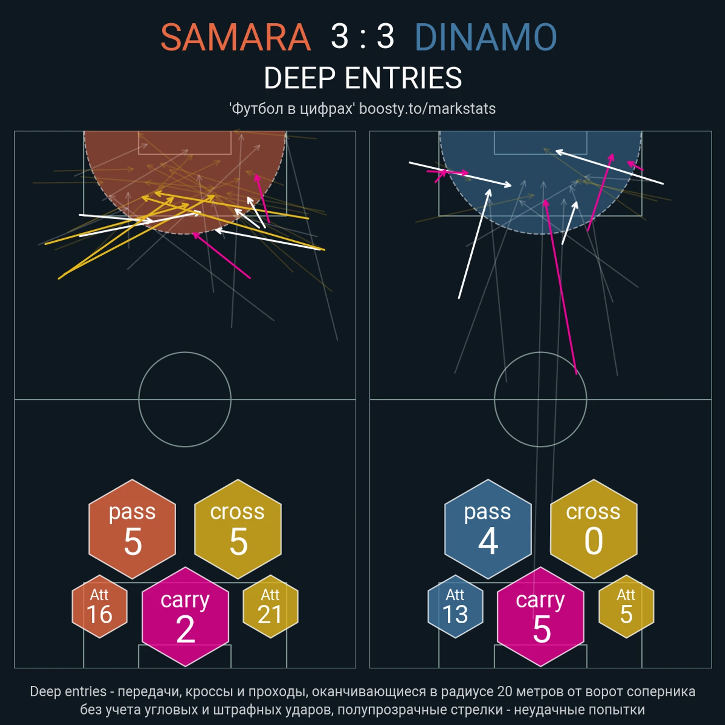Осинькин выпустил Бабкина и более чётко разделил роли в центре поля: Сергей опускался к защитникам и участвовал в начальной фазе атак, а Костанза окончательно перешёл на позицию восьмёрки с постоянными подключениями в штрафную. Самарцы наседали всё сильнее и в итоге смогли уйти от поражения. Пожалуй, закономерный итог матча. В игре «Динамо» всё больше видны тренерские идеи, но матч-менеджмент был полностью провален.