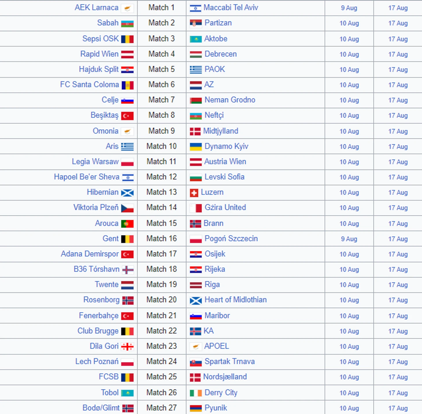 Чемпион Греции АЕК в 3-м раунде сыграет против Динамо Загреб (разница в коэффициентах 11.000/55.000 т.е. 1 к 5). Хорваты не дали шансов забить Астане (2-0 после 4-0). Здесь, победитель ушёл в сеяные клубы.