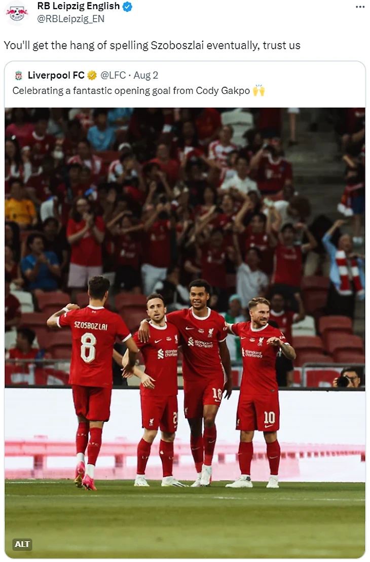 Ошибку заметили и в Лейпциге, «РБ» решил подколоть своих мерсисайдских коллег. Официальный аккаунт немецкого клуба репостнул публикацию «Ливерпуля» с фото Доминика, подписав: «Со временем вы научитесь писать фамилию Собослаи, поверьте нам».