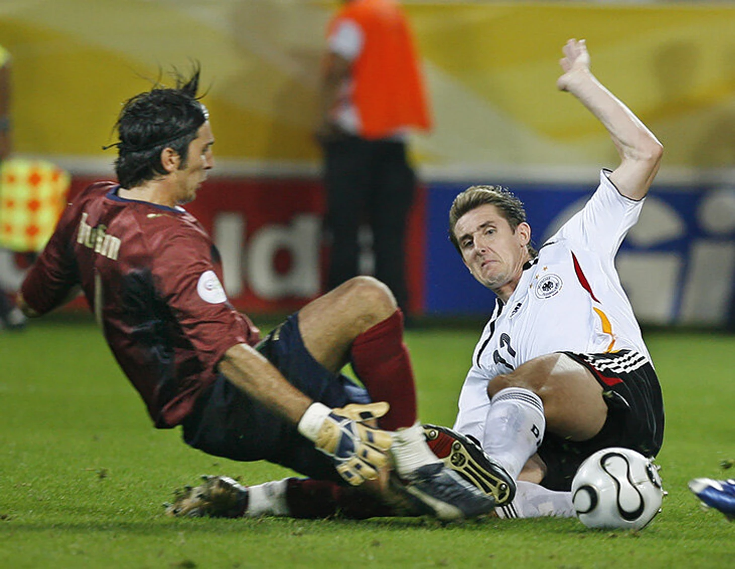 Полуфинал ЧМ-2006 считается персональным шедевром Фабио Каннаваро, но когда в середине второго тайма Мирослав Клозе прошил оборону так, словно двигался в параллельном измерении, капитан просто пятился перед ним и проиграл позицию, неправильно направив корпус. Немец выскочил один на один прямо по центру и, конечно, забил бы следующем же касанием, но его не случилось. Буффон накрыл форварда до удара.