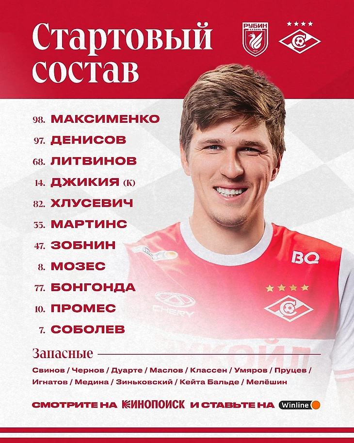 «Спартак»: Максименко, Денисов, Литвинов, Джикия, Хлусевич, Мартинс, Мозес, Зобнин, Соболев, Промес, Бонгонда