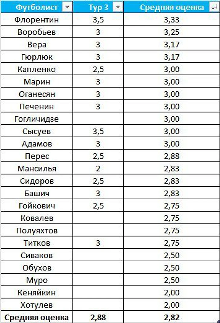 2 получает Мансилья за удаление. 2.5 получают Перес и Гойкович за цирк при первом пропущенном голе, Сидоров за привезенный пенальти и Капленко за опасный обрез.