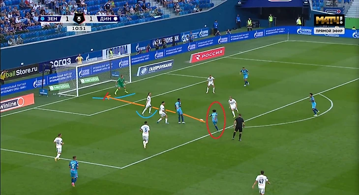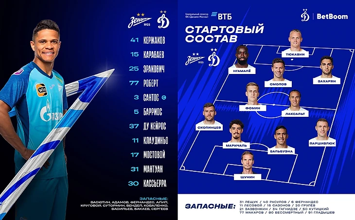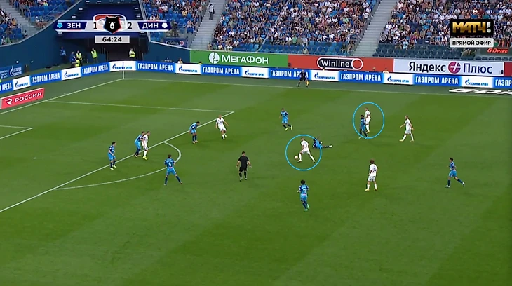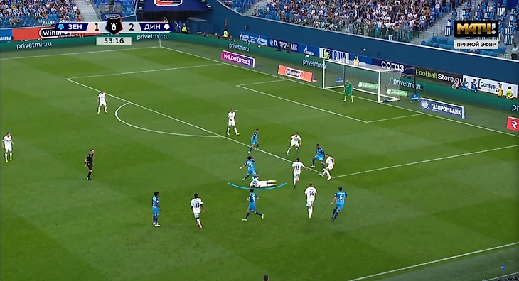 Маричаль для меня всё ещё является загадкой. Да, у него есть удачные игры и хорошие отзывы болельщиков и прессы, но мне почему-то кажется, что некоторые его действия какие-то неосознанные. В прошлой игре и Фабиан и Диего делали ему замечания, но он прошёл мимо них, словно и не слышал. А ведь они говорят на одном языке... Так и с игрой в обороне — выбегает с надеждой, что в него попадут, и в него попадают! Но так, конечно, не всегда, есть эпизоды, где он с полным осознанием бежит перекрывать соперника. И тем не менее, я всё ещё ставлю Фернандеса выше Маричаля, просто Роберто ещё не до конца понял, где оказался и что от него требуется. Кстати, СЭ писал, что Николас сбил нападающего Зенита на 9-ой минуте, а судья и VAR не назначили пенальти. После просмотра повтора есть мысли, что у VAR действительно были основания подозвать Амелина к монитору. Что ж, запишем редкую ошибку судей не в пользу Зенита. Пару Лаксальту в центральной зоне вновь составил Даниил Фомин, которого нельзя ни похвалить, ни поругать (кроме очевидного косяка в Самаре). При Личке он выполняет много черновой работы, но не всегда активно участвует в созидании, а ведь он тоже способен одним пасом обострить момент. Так и в этом мачте он старался играть, сделал несколько подборов, лучший в Динамо по эффективности ТТД — 91%. Но реально он отметился в моих заметках всего дважды: подкат на 21-ой минуте и штрафной на 80-ой минуте. В передней же линии изменений не было: Захарян — Смолов — Нгамалё, а на острие Tükawin.