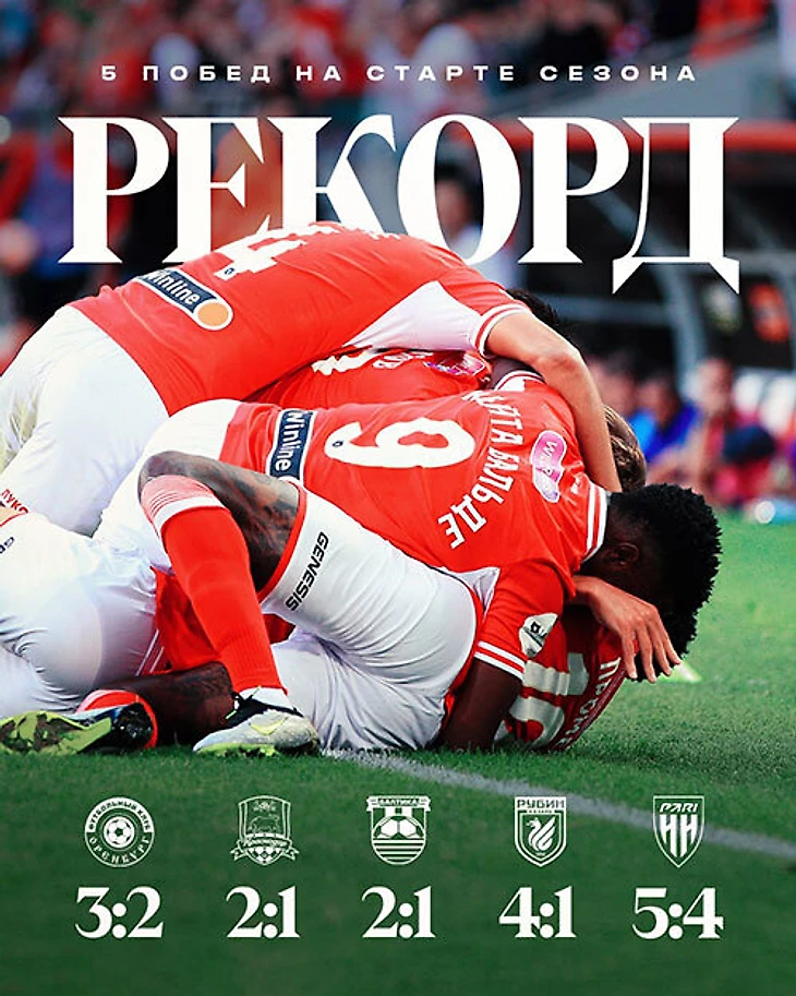 Уточним, что пять побед на старте чемпионата «Спартак» все еще не выбил. Благодаря раннему старту Кубка России красно-белые растянули победную серию на два турнира. Продлить ее могут уже в пятницу: сыграют против «Урала» в Екатеринбурге в рамках четвертого тура РПЛ. А уже 20 августа суперматч – против «Зенита» в Москве.