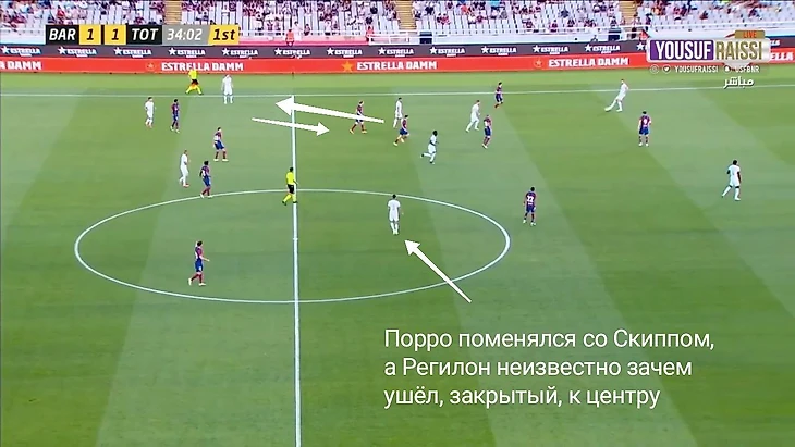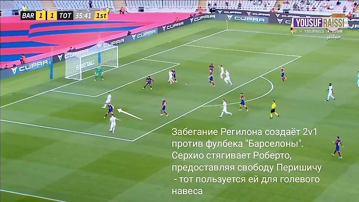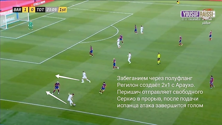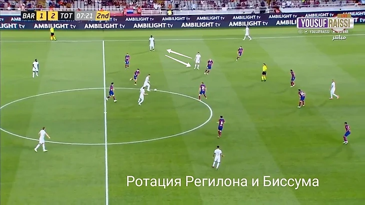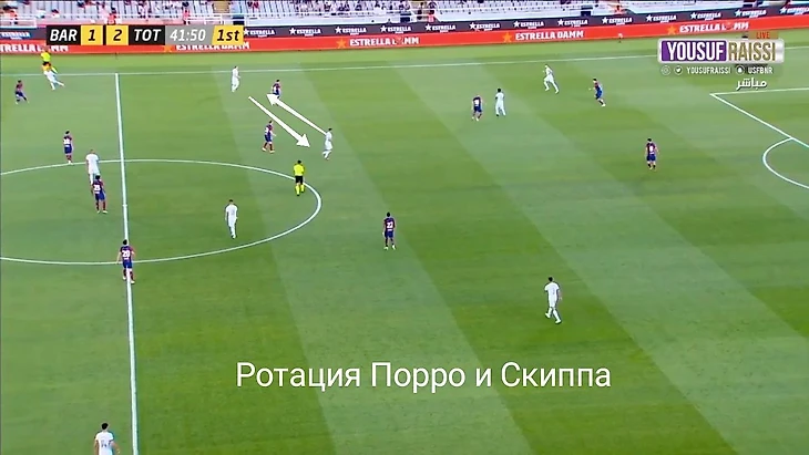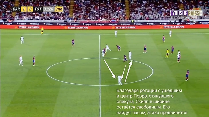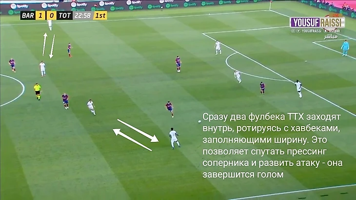 У модной структурной метаморфозы в нынешнем «Тоттенхэме» есть несколько отличительных свойств, прилично положительных. Во-первых, фулбеки Энджа чаще действуют в полуфлангах не только ради лучших развития владения и контроля ответных выпадов, оставаясь, как привычно, глубже и участвуя только в билд-апе, но и сами исключительно активно участвуют в нападении, продолжая подключаться до чужих ворот уже вингеров, через полуфланги. Такое высокое атакующее участие от ложных фулбеков постоянно создает 2v1 против крайних защитников соперника, при мяче у вингера — а Постекоглу регулярно атакует именно через ширину, — предоставляя ему либо вариант для последующей передачи чуть внутрь, на врывающегося уже фулбека, либо большую свободу для самостоятельных действий, ухода к центру на дриблинге или подачи (и первое, и второе вчера сыграло голами против «Барселоны»).
