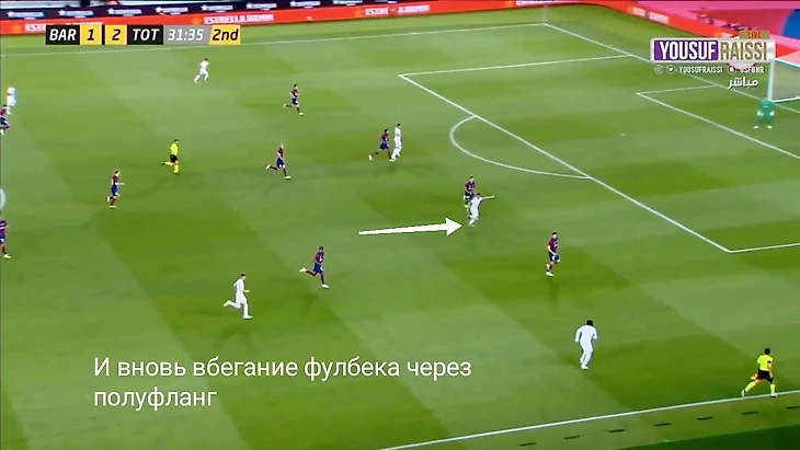 Во-вторых, крайние защитники «шпор» стараются быть вариативными и согласованными в использовании своих ложных личин: обычно внутрь заходит один, тогда как другой продолжает давать ширину в развитии, или же при открывании даже двух фулбеков в полуфлангах на места крайних защитников, ротируясь с ними, отходят из центра хавбеки. Так не только сохраняются пресловутые треугольники и удобная для продвижения структура с заполнением всех каналов, но и регулярно сбивается оригинальными открываниями с толку соперник, растягивается, даже в случае его удачной реакции, оборонительная структура — неизбежно создаются адресаты, пространство и возможности для продвижения.