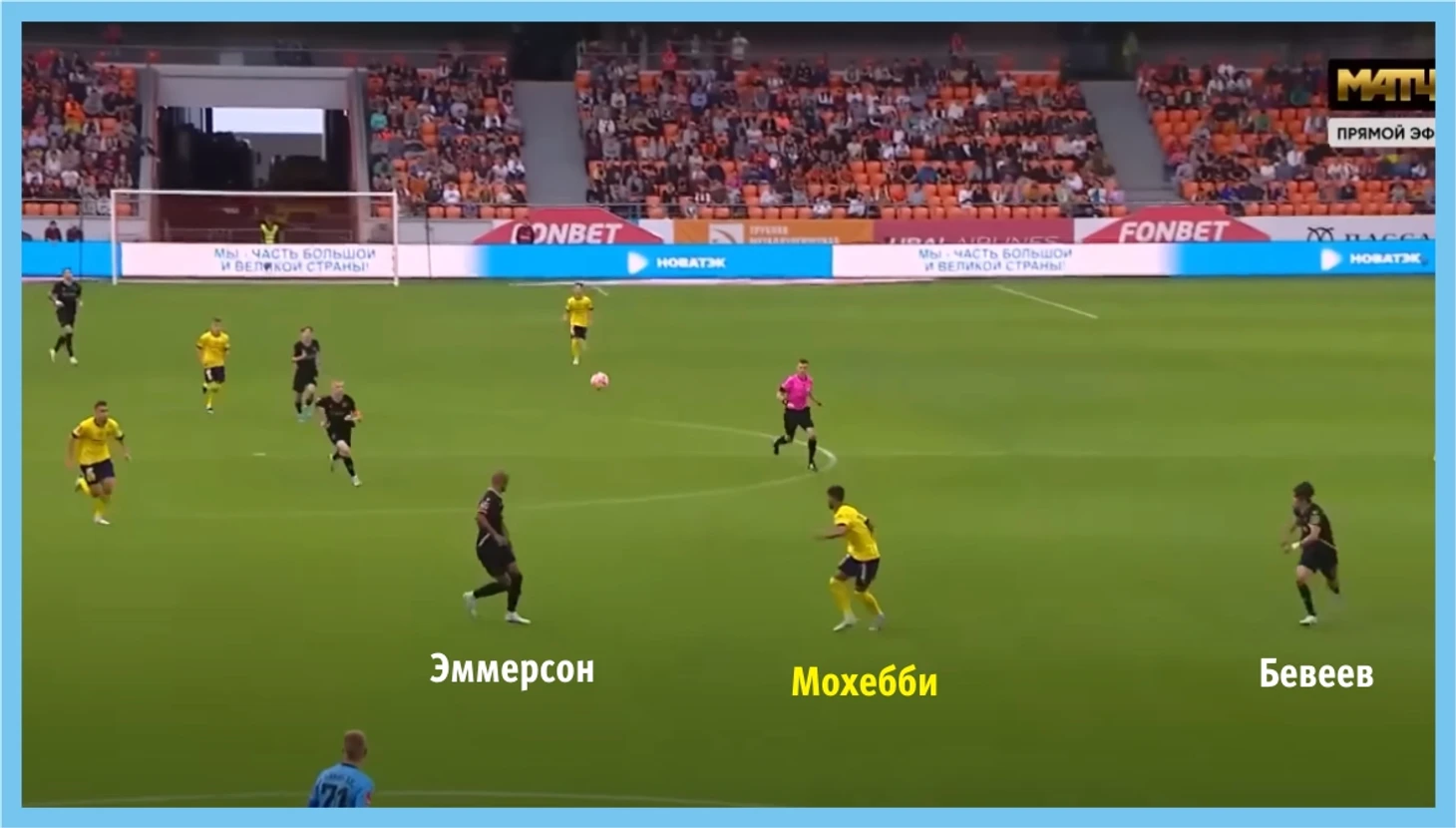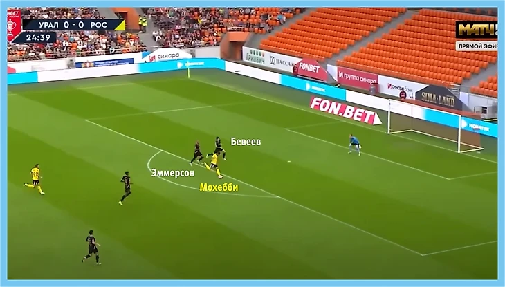 Ни шатко, ни валко, «Ростов», будучи ещё «свежим», держал равную игру, а на 25-й минуте Мохебби воспользовался недочётом в обороне «Урала». Выше видим, как иранец расположился между двумя защитниками и аж от Песьякова получил передачу.
