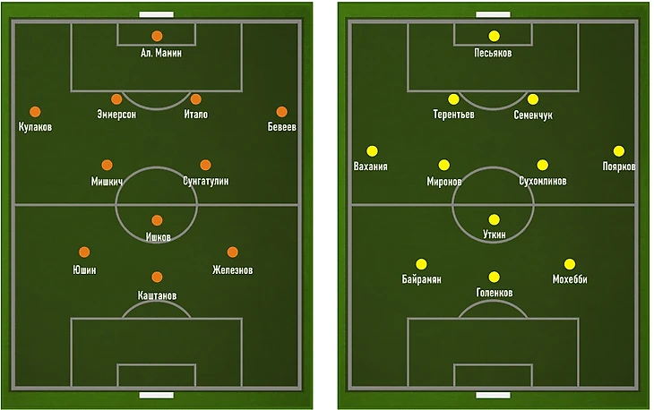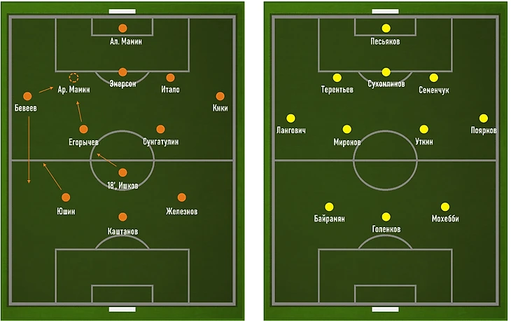 После замены Мамина, Бевеев закрыл зону третьего центрального, а Егорычев и Юшин получили задание больше возвращаться в оборону. Если Бевеев подключался по флангу, Егорычев его страховал, Ишков поднимался выше; а если Бевеев переходил в центр, Юшин поднимался к защитной линии.