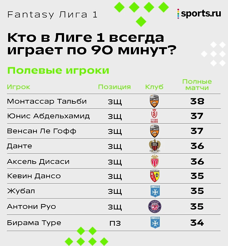 • Единственный футболист, отыгравший все туры целиком – экс-футболист «Рубина» Монтассар Тальби. Перешел прошлым летом и стал как влитой. У его партнера по «Лорьяну» Ле Гоффа 37.