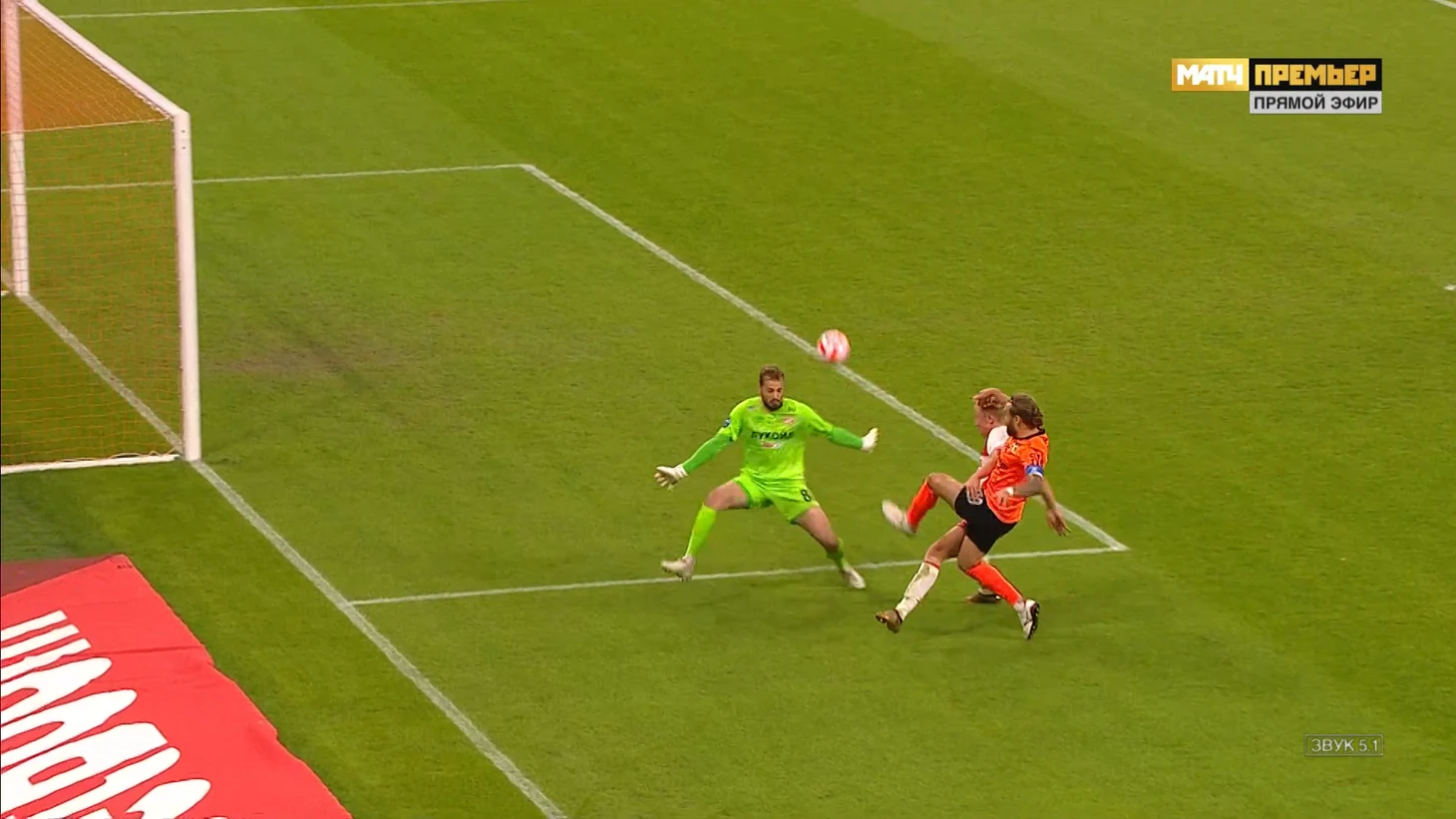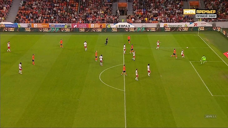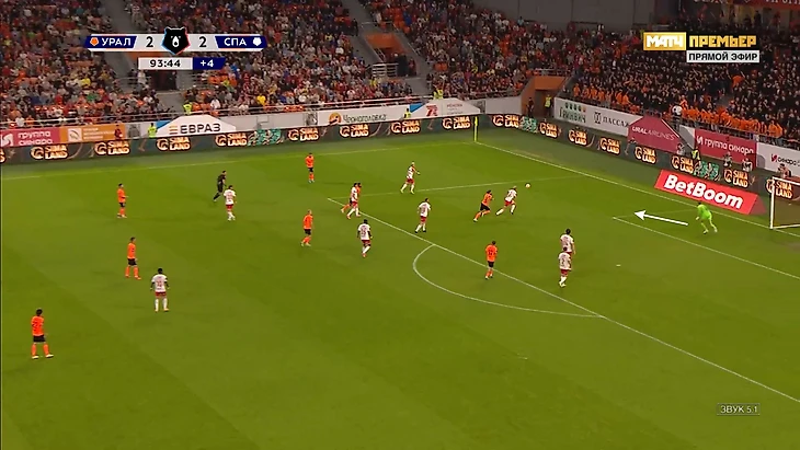 Дальше никакой опасности для ворот нет, Руслан первый на мяче, а Свинов выскочив на мяч решил не вмешиваться в эпизод понимая, что защитник контролирует ситуацию, ставь корпус и не подпускай Бикфалви к мячу и/или просто отправляй мяч в аут. Уже в этом эпизоде понятно, что вратарь до мяча не доберется, а решение дождаться выхода мяча в аут или начать его сохранять создает опасную ситуацию.