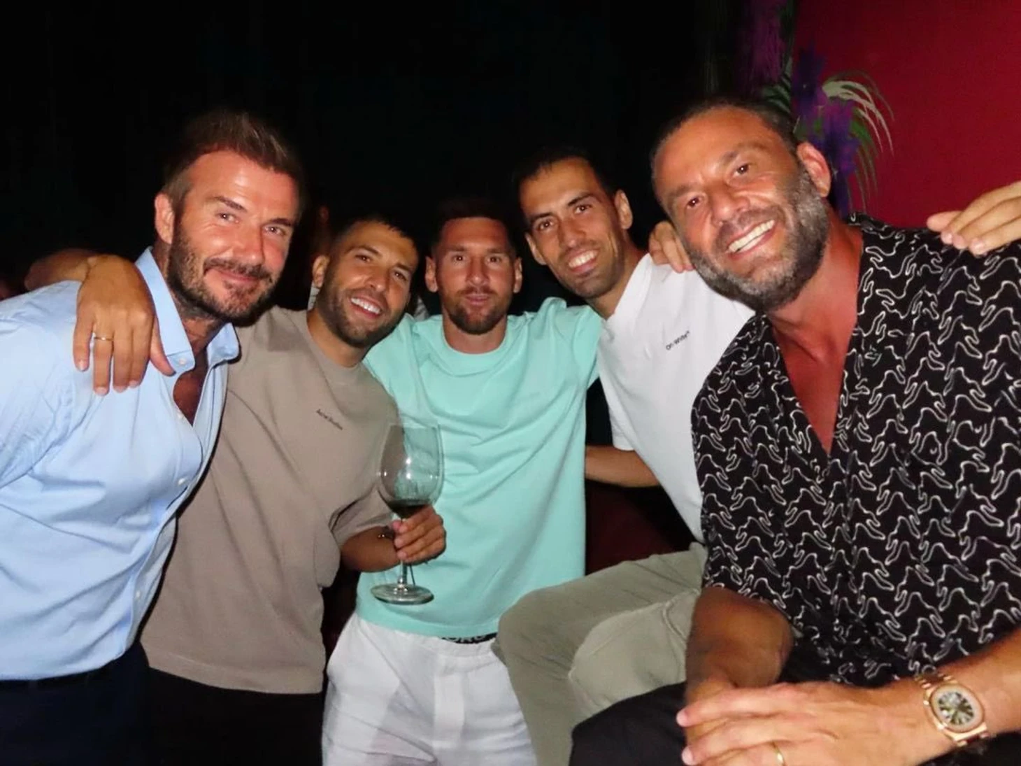 А Месси умеет улыбаться вне поля? Лео сходил в клуб с Антонеллой, Бускетсом, Альбой и Бекхэмом – на всех фото он был не в своей тарелке