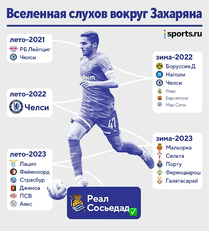 Впервые информация об интересе европейских клубов к Захаряну появилась в августе 2021-го – «СЭ» сообщал, что за лучшим молодым игроком РПЛ сезона-2020/21 следят «РБ Лейпциг» и «Челси». «Динамо» выставило 12 млн евро как цену за 18-летнего на тот момент футболиста.