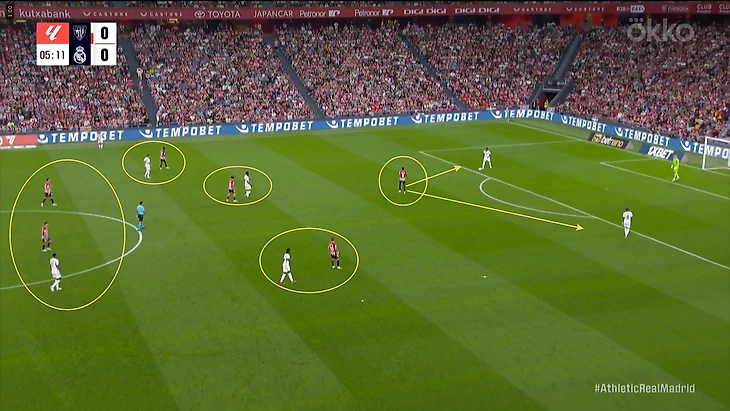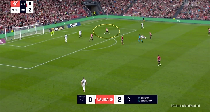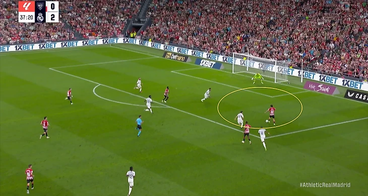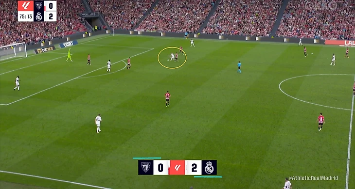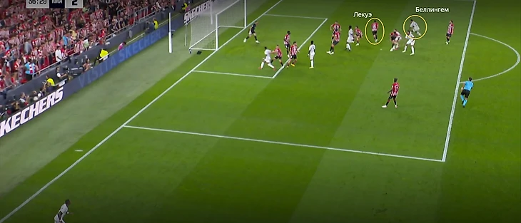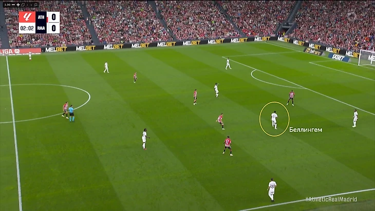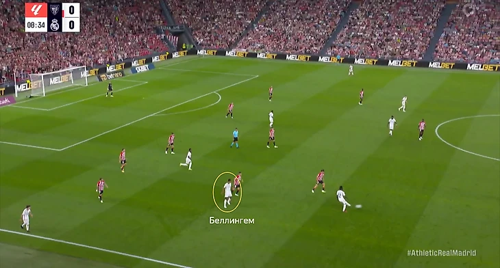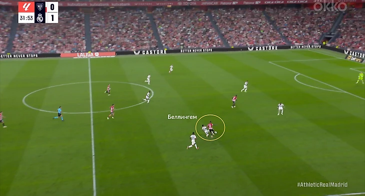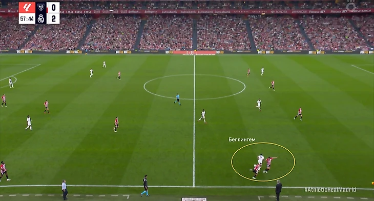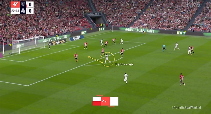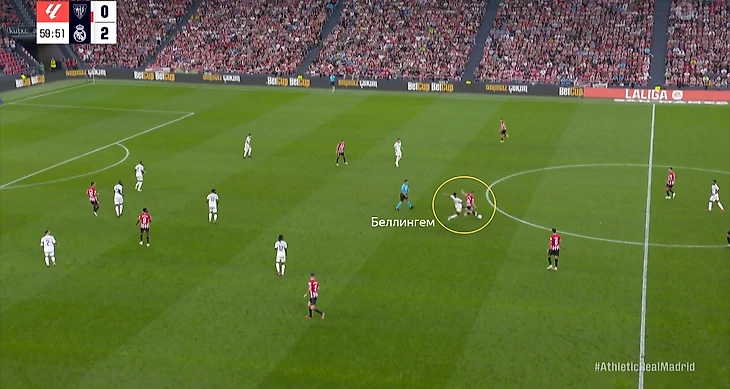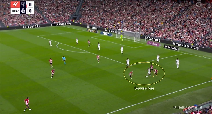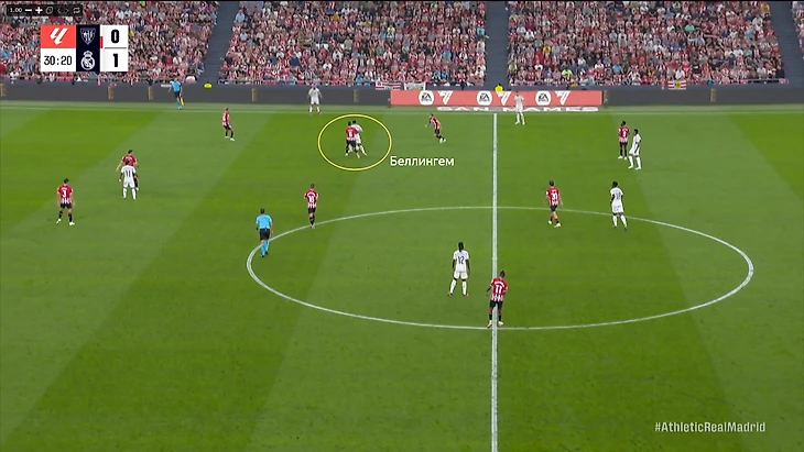 В начале атак часто возникала ситуация, когда Беллингем оказывался против двух опорников «Атлетика». Подобная проблема была и в товарищеском матче против «Барселоны». Англичанин был вынужден разрываться между двумя соперниками, из-за чего один из опорников «Атлетика» получал больше свободы. Если бы хозяева смелее использовали данный вариант, то могли бы больше создать через центр.