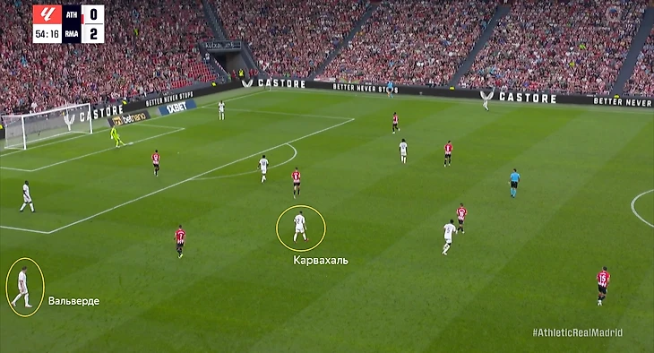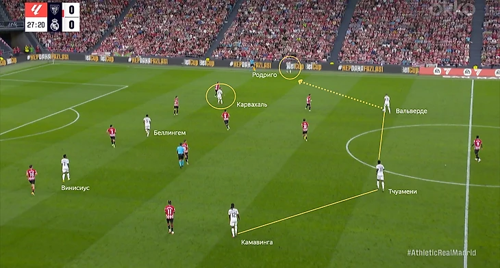 Камавинга помогал Тчуамени держать опорную зону. Также свободное пространство помогал закрывать Вальверде. Благодаря этому Карвахаль получал необходимую свободу.