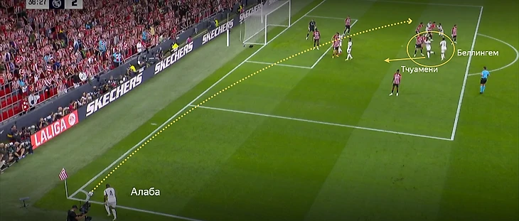 В эпизоде с голом Беллингем и Тчуамени здорово переиграли соперников. Во-первых, угловой подавал левша Алаба, поэтому мяч закручивался в сторону от ворот. Во-вторых, француз и англичанин запутали оппонентов, действующих по ним в штрафной. Тчуамени увёл соперника ближе к воротам, а Беллингем отскочил в свободное пространство. После чего получил возможность без опеки пробить по воротам.