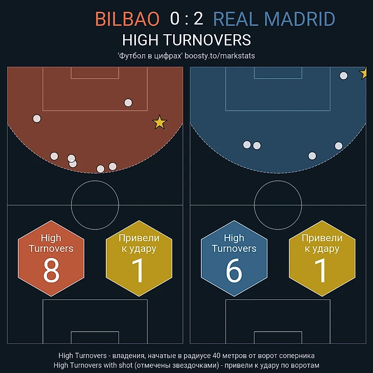 Косвенно это отражает наклон поля (59.5% на 40.5% в пользу «Атлетика»). Данный показатель основывается на количестве действий на чужой трети поля. Тот факт, что команда Анчелотти меньше закреплялась у чужой штрафной, связан с непривычной ролью Винисиуса и не до конца выстроенными взаимодействиями. Отчасти на это повлияло то, что во втором тайме «Мадрид» местами отдавал инициативу, но фактор не самой удобной роли Жуниора тоже сказался.