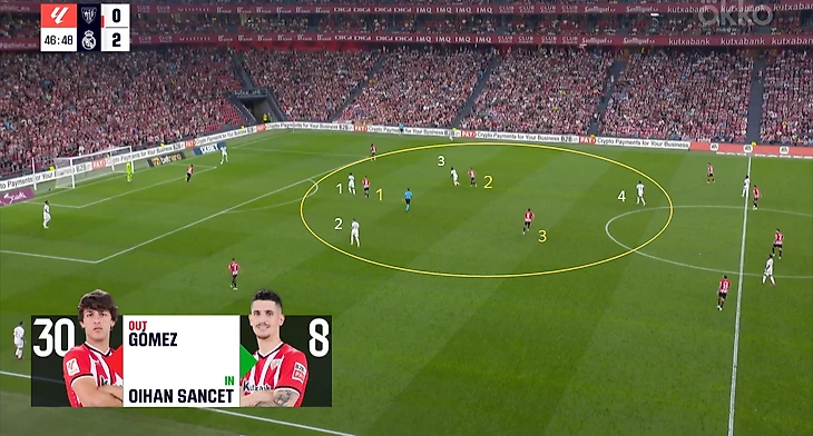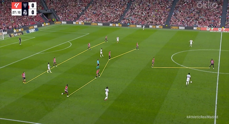 Без мяча «Атлетик» встречал соперника по схеме 4-2-3-1: Иньяки Уильямс действовал по центральным защитникам (выдвигался на игрока с мячом), следующая линия пыталась закрыть тройку полузащитников «Мадрида», а пара опорных отвечала за Беллингема.