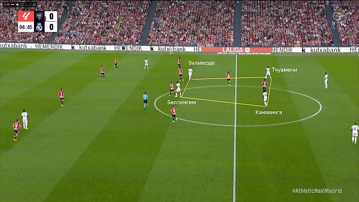 «Мадрид» действовал с ромбом и использовал все преимущества данной формации: Камавинга опускался к Тчуамени в опорную зону, добавляя надёжности. С мячом появлялась дополнительная опция для паса.
