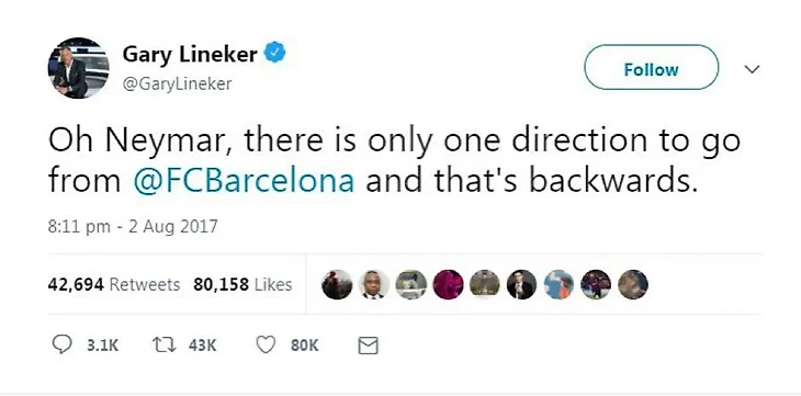 За день до официального подтверждения трансфера Линекер выдал такой твит: «Ох, Неймар, из «Барселоны» можно идти только в одном направлении − на задворки».