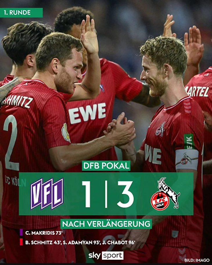 Голы: Шмитц, 43 (0:1); Макридис, 73 (1:1); Адамян, 93 (1:2); Шабо, 96 (1:3) «Кельн» лишь в дополнительное время сумел одолеть «Оснабрюк» усилиями Адамяна и Шабо. Кстати, не так давно, три года назад, «Оснабрюк» и «Кельн» уже накладывались друг на дружку в розыгрыше Кубка Германии. И тогда сенсации не произошло, в результате победы"козлов" со счетом 1:0. В новом для себя дивизионе (в прошлом году они заслужили повышение до второй лиги) команда «Оснабрюк» еще не побеждала, а потому перед матчем у болельщиков «Кельна» голова была забита лишь тем с каким счетом их команда победит. На деле все оказалось куда сложнее. Шмитц открыл счет под занавес первого тайма и казалось положил начало победе гостей, но во втором тайме «Оснабрюк» если не выглядел лучше, то уж точно не слабее гостей, что привело к голу на 73-минуте. В итоге команды ушли в овертайм, где явно мотивированные, а возможно отчитанные тренером “козлы” пришли в себя и добились победы.