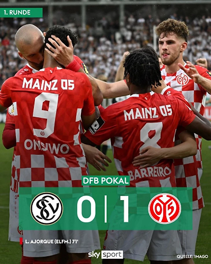 Кубковый поход для «Майнца» стартовал выездным матчем с «Эльферсбергом». Хозяева ранее выиграли третью Бундеслигу и уже начали сезон во второй. Разница в игровом тонусе почти не сказалась на содержании игры. Если бы не одно «но» - этот самый тонус вратаря Николаса Криштофа. Уже к двадцатой минуте кипер«Эльферсберга» выдал три классных сейва после ударов Ажорка, Баррейры и Онисиву. Первый тайм в целом прошел в одни ворота - 10:1 по ударам в пользу «Майнца». Было и взятие ворот - отличился Ажорк, позднее увидевший флаг ассистента судьи. Хотя вопрос о том, действительно ли имел место офсайд, остаётся открытым. Проблемы гостей с реализацией продолжились и после перерыва. Ли с линии вратарской угодил в спину защитника, Белль после углового - в руки вратарю. Судьбоносным для «Майнца» стал пенальти, который заработал Каси. Ажорк с третьей попытки зажег свою фамилию на табло - 0:1. Весьма интересно, что до 87-й минуты «Эльферсберг» лишь раз пробил по воротам гостей из Бундеслиги, после нее - четыре раза. Все это - плоды трудов вышедшего на замену Пауля Стока. Он даже должен был сравнивать счёт, когда пробил в штангу, а на добивании допустил промах мимо пустых ворот. Счастье для «Майнца» - не пришлось играть экстра-таймы, выход в следующий раунд оформлен в основное время.