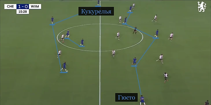 Маурисио Почеттино с предсезонки отрабатывает один и тот же атакующий паттерн. Владение «Челси» разбивается на две фазы. Первая – стартовая: опорник садится к центральным защитникам, восьмерки – открываются повыше.