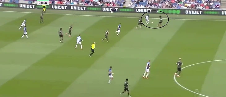 Лавиа быстро реагирует на передачи. Стоило игроку «Брайтона» занести ногу для паса, как Ромео подстроил корпус для перехвата.