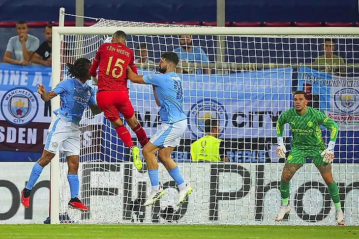 У форварда уникальная манера прыжка: он разбегается на широком шаге, на секунду застывает – и вверх. Эффективно и непривычно для защитников, за эту секунду он ловит соперников – как сейчас центральных защитников «Сити».