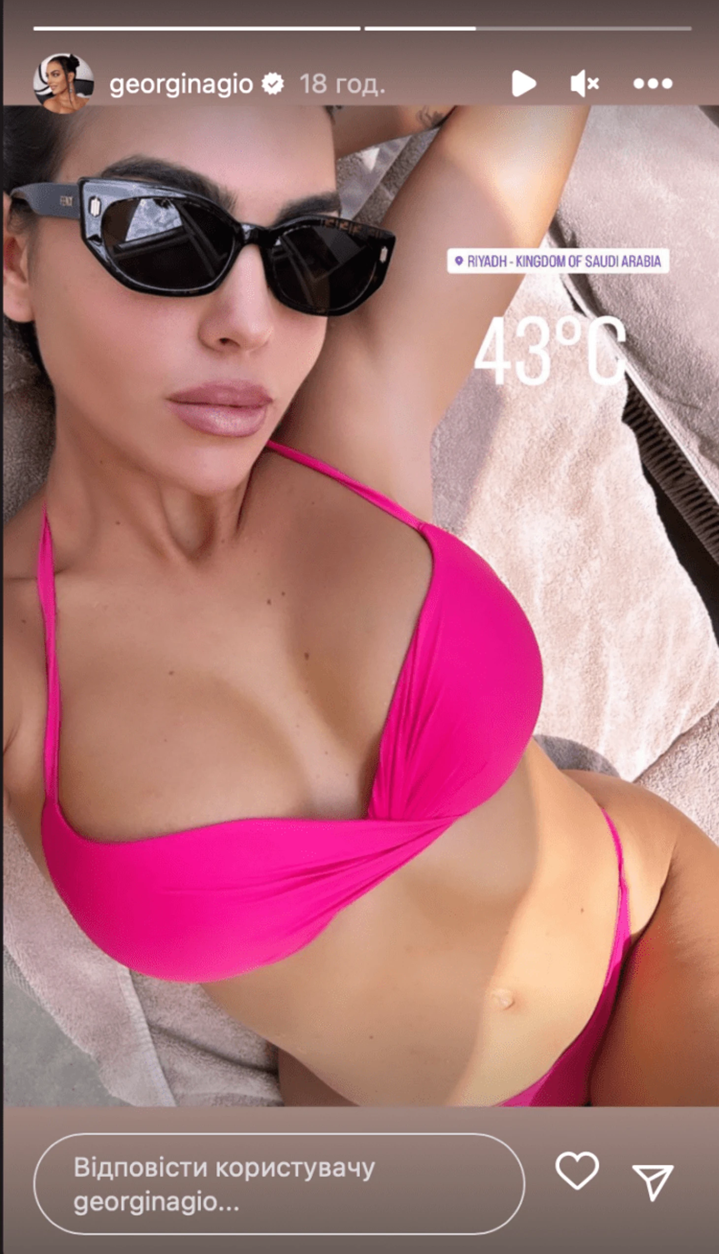 Невеста португальского футболиста Криштиану Роналду предстала в ярко-розовом бикини. К пляжному образу звезда соцсетей добавила черные солнцезащитные очки и собрала свои темные волосы. Джорджина обозначила локацию своего отдыха — Саудовская Аравия. Здесь они с семьей живут последние несколько месяцев, ведь спортсмен подписал контракт с ФК "Ан-Наср".