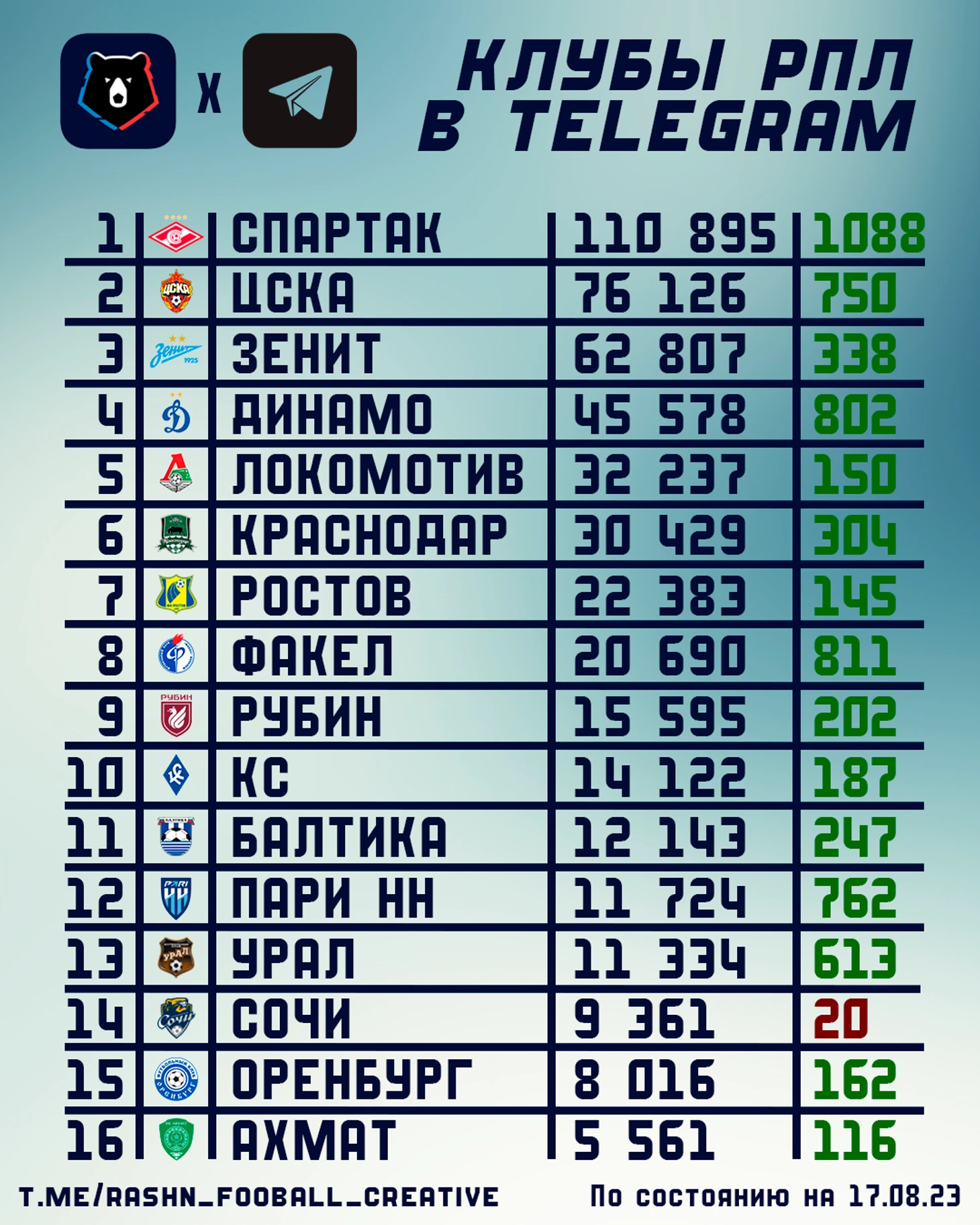 В целом, в верхней части таблицы клубы уверенно заняли свои места и размена с большой долей вероятности здесь не будет. Еще из интересных феноменов отмечу факт, что у «Динамо» в начале июля был безумный прирост и канал вырос с 40 тысяч до 53,4. После братского кубка телега стабильно теряла в цифрах, и эта неделя - первая, когда счетчик пошел в плюс.