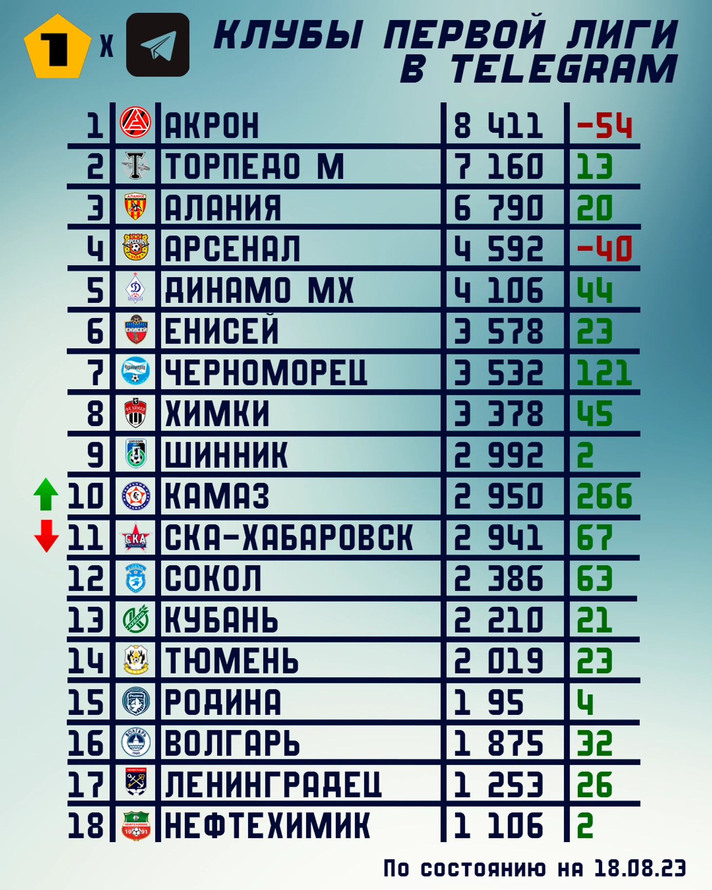 «Акрон» хорошо набрал в прошлом сезоне, знатно пошумев в Кубке. Сейчас команда с каждой неделей то наберет, то потеряет. В целом число держится на одном и том же уровне. Еще заметил, что в ФНЛ колебание числа подписчиков сильно привязано к результатам команды, сильнее, чем в РПЛ.