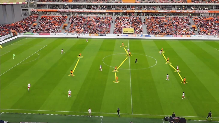 Цель – прессинг по мячу около чужой штрафной, который спровоцирует ошибку или вынос. Еще «Урал» мешает при разворотах на фланг: команда расставляет ловушки и агрессивно поджимает, закрывая ближайшие варианты для передач. Так команда Гончаренко перекрывает начало атак через центр и усложняет движение на краях.
