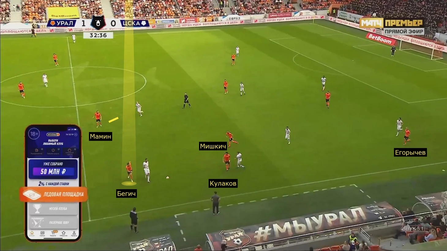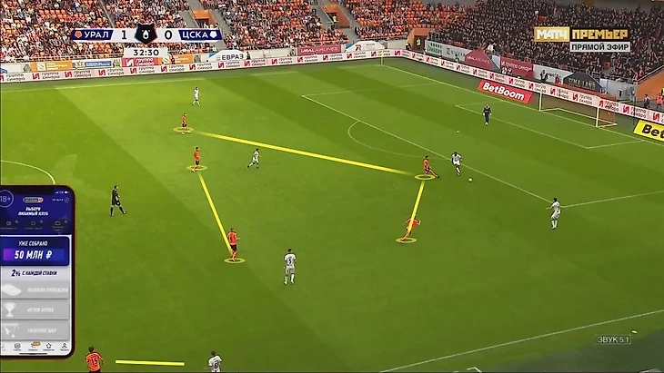 В этом эпизоде «Урал» подвижно поджимал ЦСКА: организовал давление по тройке защитников, закрыл короткие варианты в середине, при переводе на фланг разобрал всех 1-в-1, а за Заболотным вышел Бегич. В итоге «Урал» выжал атаку на фланг, принудил к длинной передаче и свел все к борьбе, чем остановил продвижение.