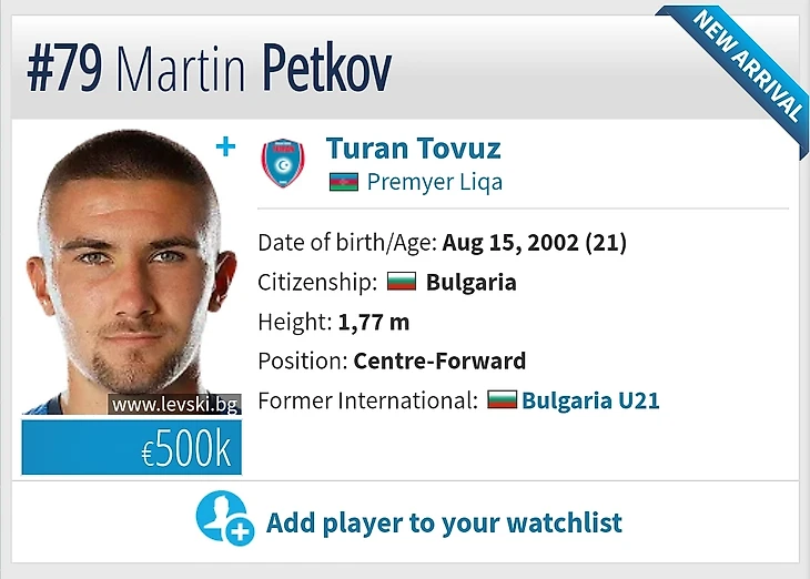 21 летний болгарский игрок недавно перешел Туран Товуз из болгарской Софии как свободный агент. У него есть отличный потенциал ему недавно исполнился 21 года и его стоимость 500 тысяч в евро. Его позиция Центр-Форвард. Он сыграв уже 3 игры за Туран Товуз забил 2 гола, что доказывает о нем многое.