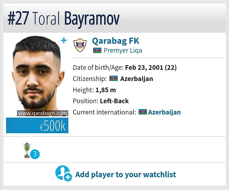 Торал Байрамов азербайджанский левый защитник который потенциальный. Это футболист у которого очень хороший дриблинг и дальние удары. В прошлом сезоне футболист забил гол и сделал 6 ассистов в 34 играх. Также ходят слухи что футболистом Карабаха и сборной Азербайджана очень сильно интересуется турецкий Галатасарай. А что насчет из русских команд то интересовалась Крылья Советов.