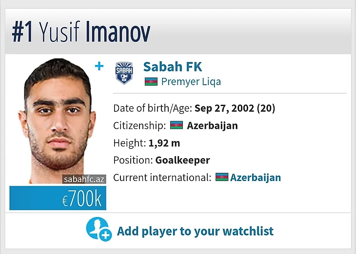 Исиф Иманов азербайджанский вратарь которому 20 лет. Рост вратаря 192 сантиметров. Стоимость оценивается 700 тясяч евро. Вратарь в прошлом сезоне в 26 матчах пропустил 27 голов а в 19 матчах вовсе не пропустил не одного гола. Вратарь даже успел сыграть в сборной Азербайджана.