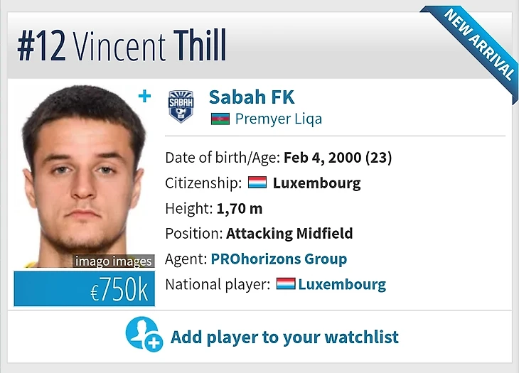 Венсан Тилль - люксембургский атакующий полузащитник который недавно перешел в Сабах. Футболист 2018 году оценивался в 3 миллионов а сейчас 750 тысяч. Несмотря на это футболист все еще остается потенциальным игроком. В прошлом сезоне футболист 16 играх забил 1 гол. Футболист также играет в сборной Люксембурга, где в 48 играх щабил 3 гола и сделал 8 ассиста.