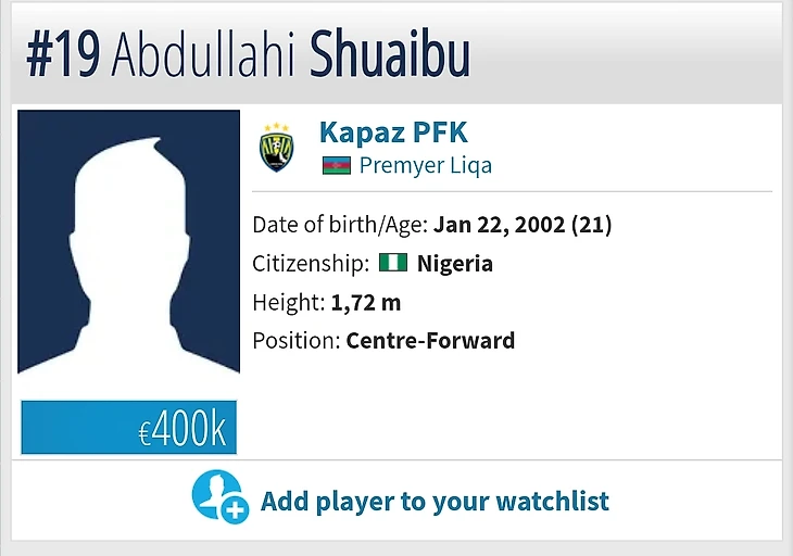 Абдуллаи Шуайбу футболист из Нигерии. Футболисту 21 года и играет на позиции Центр-Фоварда. Абдуллаи очень хорошо показывает свою игру благодаря его умению забивать много голов. Футболист в прошлом сезоне в 36 матчах забил 12 голов и сделал 5 ассистов и тем самым став самым забивным игроком команды прошлом сезоне.