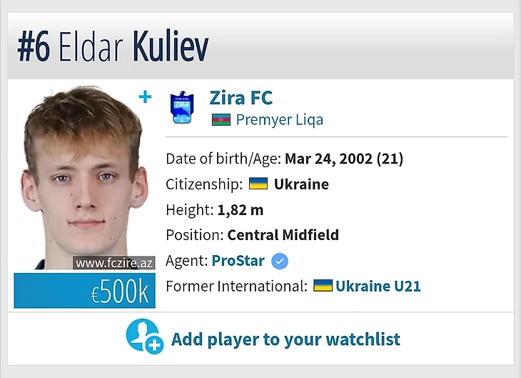 Эльдар Кулиев родился в Украине. Футболисту 21 года и он уже стоит 500 тысяч евро. Играет на позиции полузащитник. Футболист в прошлом сезоне в 28 матчах забил 3 гола и отдал 1 ассист.