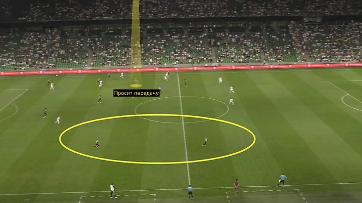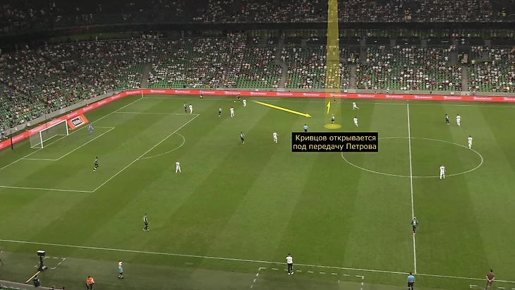 Зато в этой атаке Сперцян исполнил красивейшую передачу. Принял мяч в глубине, продвинулся к штрафной, воспользовался ролями Баши (стянул Карпукаса), Кривцова (ранее при переводе налево утащил Погостнова) и Кордобы (держал рядом Фассона), а затем нашел небольшой коридор под рывок Волкова.