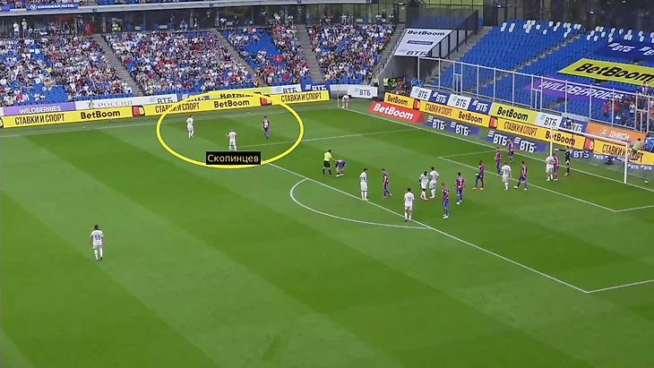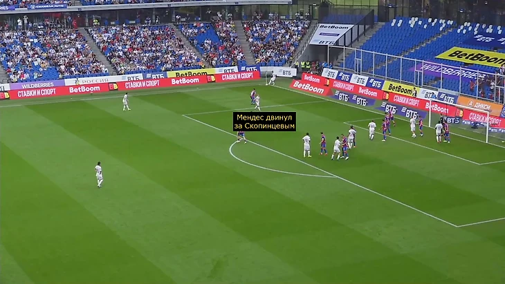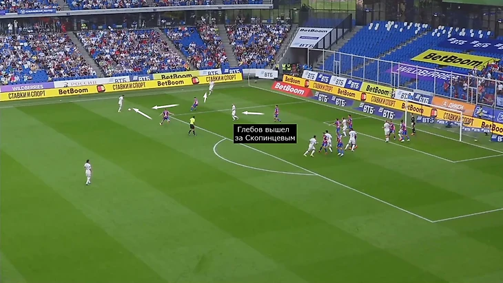 ЦСКА воспользовался движением Лаксальта (часто разрывался в таких ситуациях). Затем Мухин эталонно утащил за собой Скопинцева (еще и классно открылся уже в штрафной), освободив фланг для Глебова, а Здьелар заметил огромную зону справа.