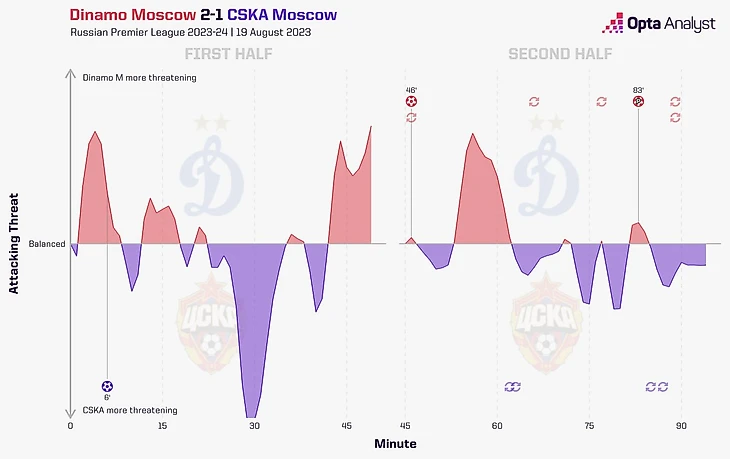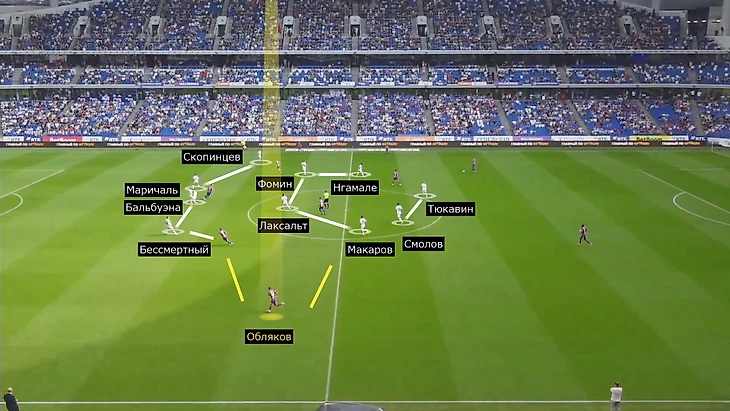 В первом тайме ЦСКА создал несколько подходов и моментов. Команда Федотова пользовалась тем, как «Динамо» встречало: Нгамале и Макаров располагались узко, крайние защитники ориентировались на Мухина и Чалова, из-за чего освобождалось пространство для Облякова и Глебова. Эффект был радикальнее, если ЦСКА начинал атаку на фланге: при таком раскладе «Динамо» там группировалось (например, если прессинговал Нгамале слева, Макаров заужал в середине), а зона для подключений на противоположном крае увеличивалась.