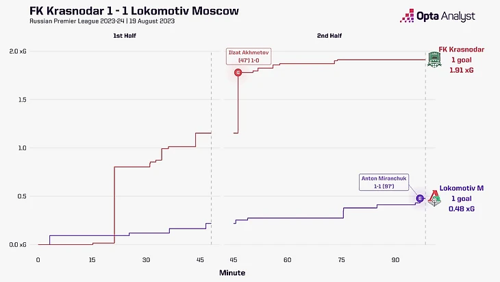Но много проблем и в атаке: не реализовали моменты первого тайма с «Рубином» (затем с трудом спаслись), создавали только после стандартов в Воронеже, ничего не вымучили с игры против ЦСКА, нанесли 2 удара с «Крыльями» (с углового и шальная попытка Марадишвили). В итоге «Локомотив» поджал «Краснодар» только в конце матча: 4 удара из штрафной из 7 – снова стандарты, выбили всего 0,48 xG.