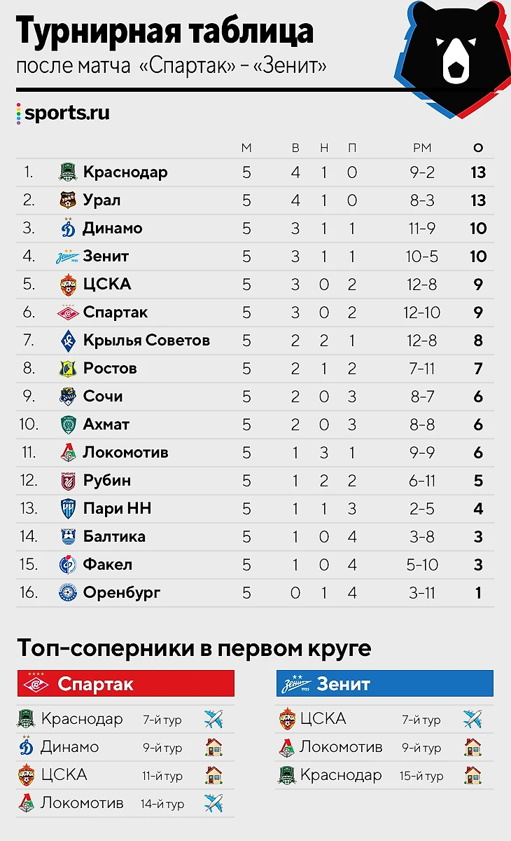 Пару туров назад «Спартак» шел без поражений и с отрывом в пять очков от «Зенита» (петербуржцы потеряли очки с «Ростовом» и «Динамо»). И вот петербуржцы обошли красно-белых, которые уже шестые. «Спартак» проиграл в двух турах подряд – «Зениту» и «Уралу» (2:3).