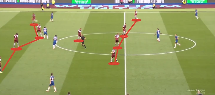 «Вест Хэм» при этом защищался по схеме 4-1-4-1. Выходит, передняя линия «Челси» получала численное преимущество перед защитой Дэвида Мойеса – пять против четырех.