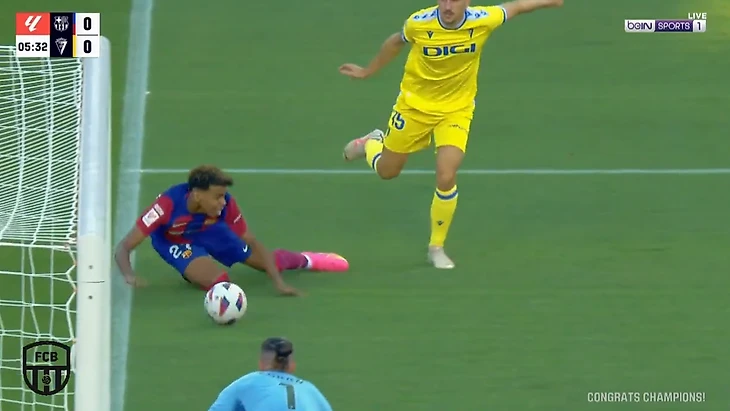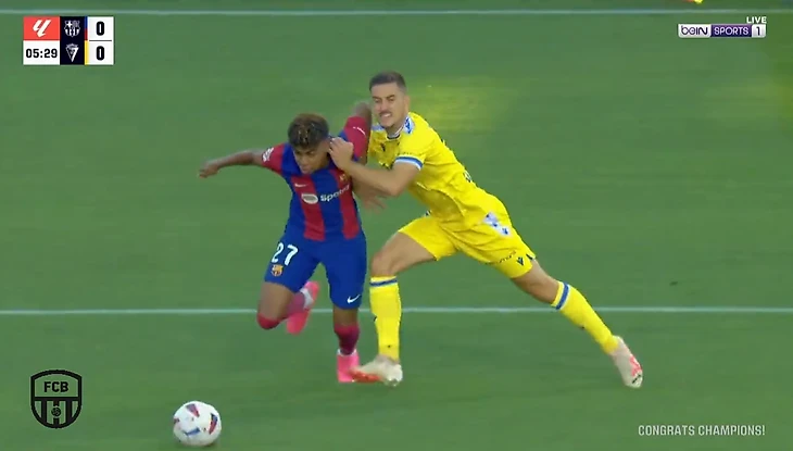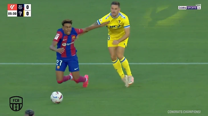 В самом начале встречи, на 6-й минуте, Эрнандес толкнул Ямаля в штрафной. 16-летний Ламин упал на газон.