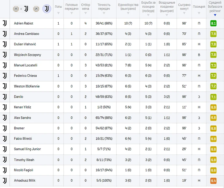Оценки игроков «Ювентуса» за матч против «Удинезе» от Sofascore