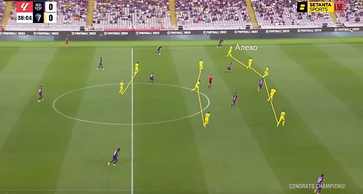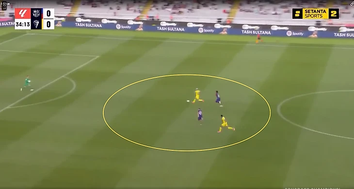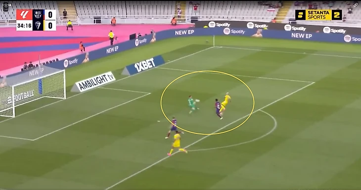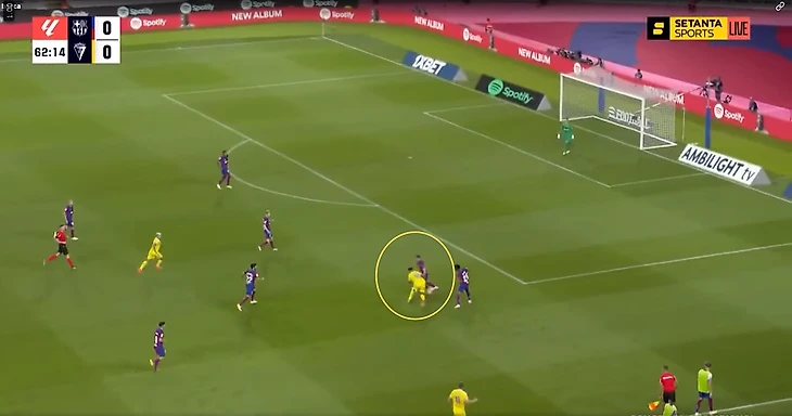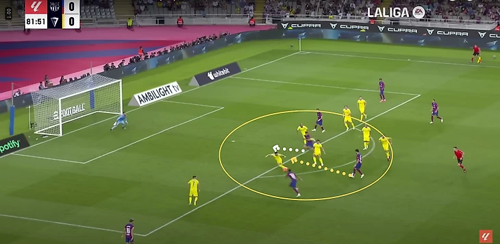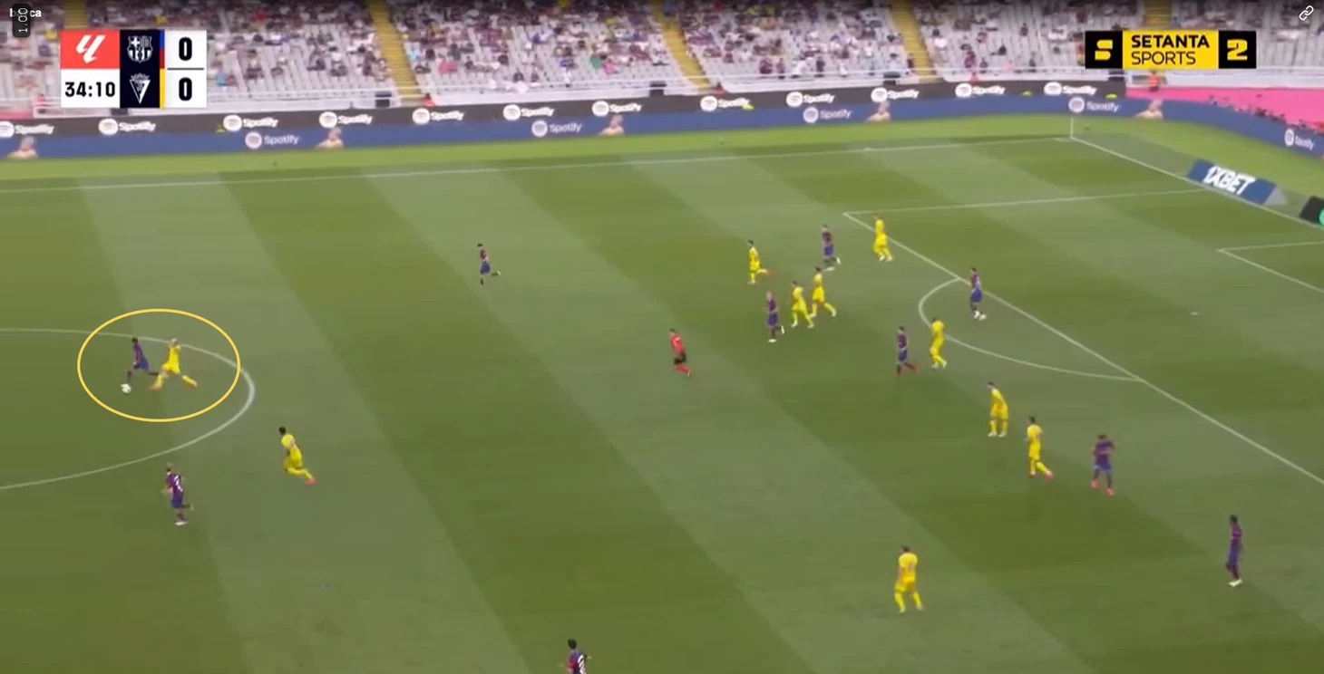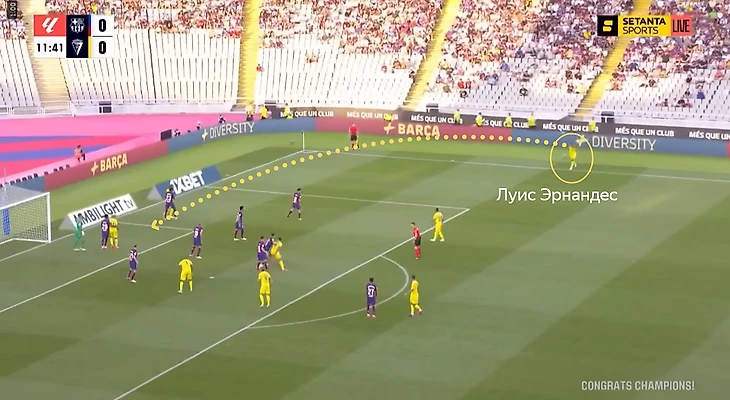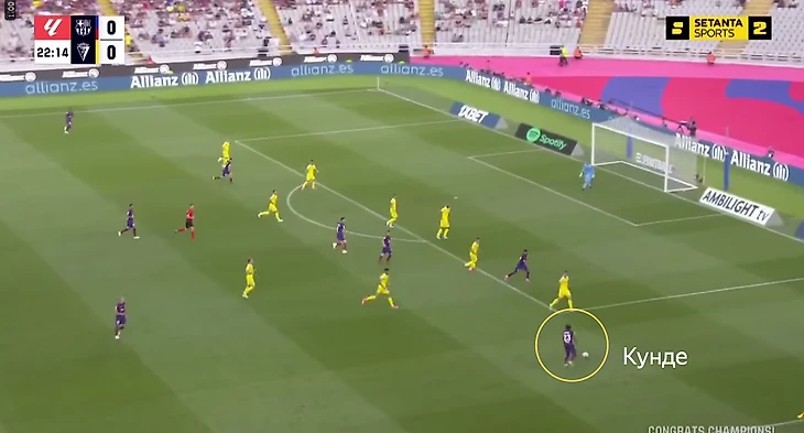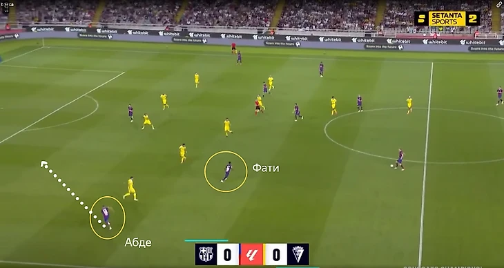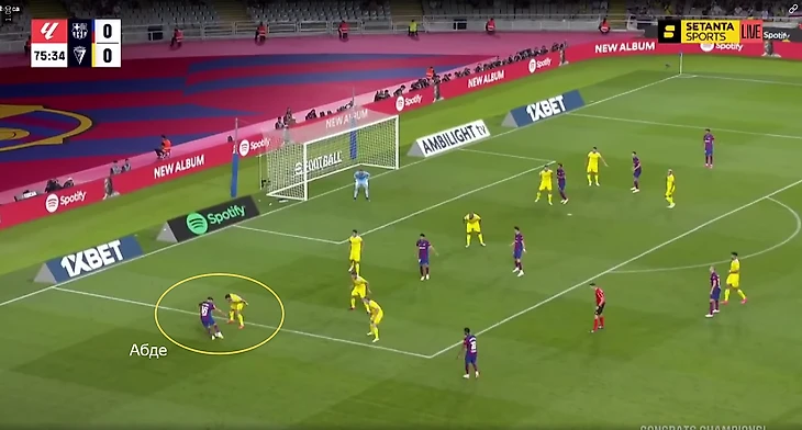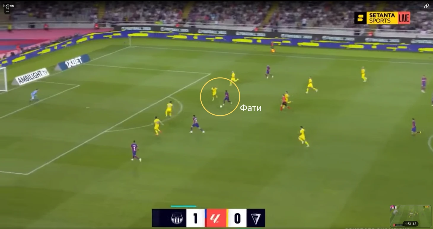 По ходу второго тайма на поле вышли Фати (вместо Гави) и Абде (вместо Бальде). Ансу действовал в левом полуфланге, уходил в глубину и взаимодействовал с партнёрами в центре поля, пытался открываться между линиями и обострять, а Абде создавал ширину слева и регулярно шёл в штрафную на дриблинге.